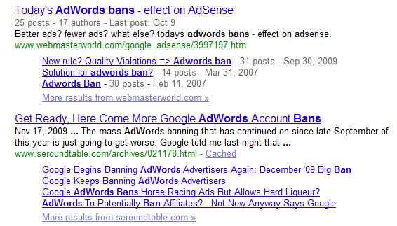 traditional single listing with 4 links under it (often with dates near them) for forums & some blogs