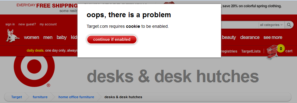 That above "screw you" redirect error has been going on literally for weeks now, with Target's webmaster asleep at the wheel. Perhaps they want you to navigate their site by internal search so they can track every character you type.