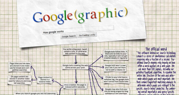 This image might need updated in the years to come, but it does a great job laying out how Google works when you type a query into their search engine. Search is so easy to do that it is hard to appreciate how complex it is unless you take a look under the hood. Which is exactly what this graphic does :D